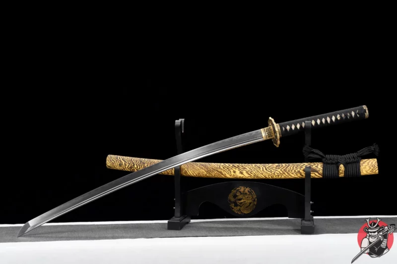 Vagt (Tsuba 鍔): Tsubaen er fremstillet af guldbelagt kobber, som kombinerer elegance med funktionalitet. Den gyldne glans tilføjer et luksuriøst præg, mens kobberets korrosionsbestandighed sikrer lang levetid. Tsubaen fungerer også som en modvægt, der bidrager til Katanaens overordnede balance.