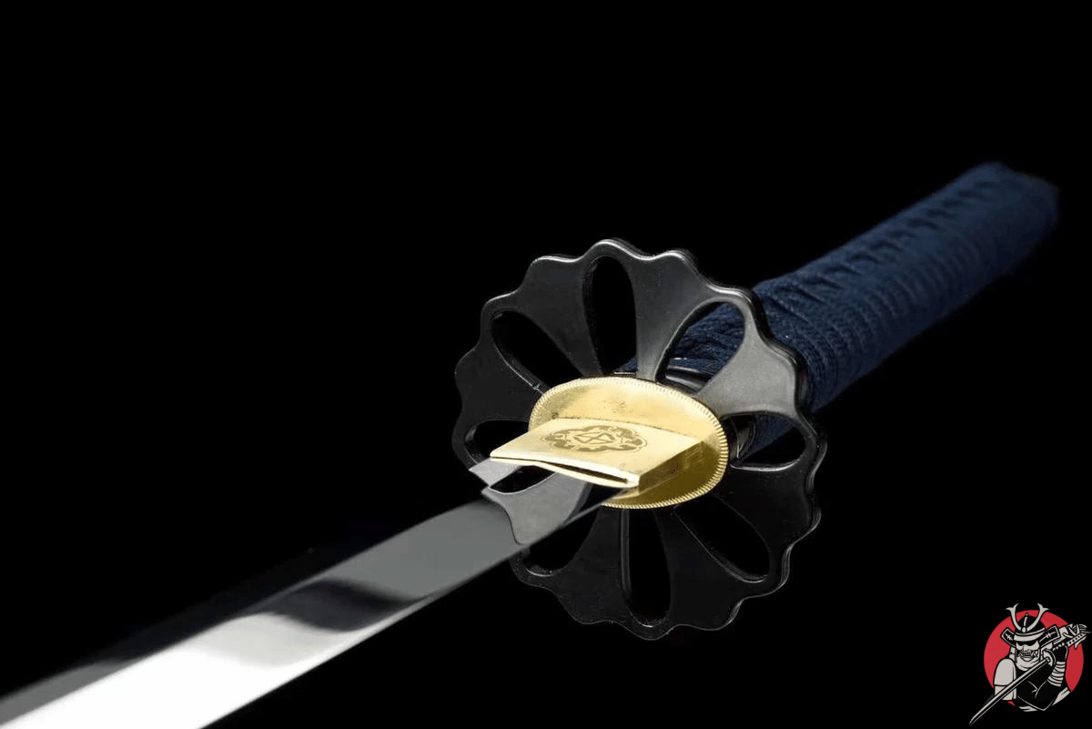 Skede (Saya 鞘): Den rødlakerede træskede med mørkeblå Sageo tilføjer Katanaen et dristigt og sofistikeret udtryk. Lakeret træ er valgt for sin holdbarhed og glatte finish, hvilket beskytter klingen mod elementerne, mens det fremhæver Katanaens æstetiske kvalitet.
